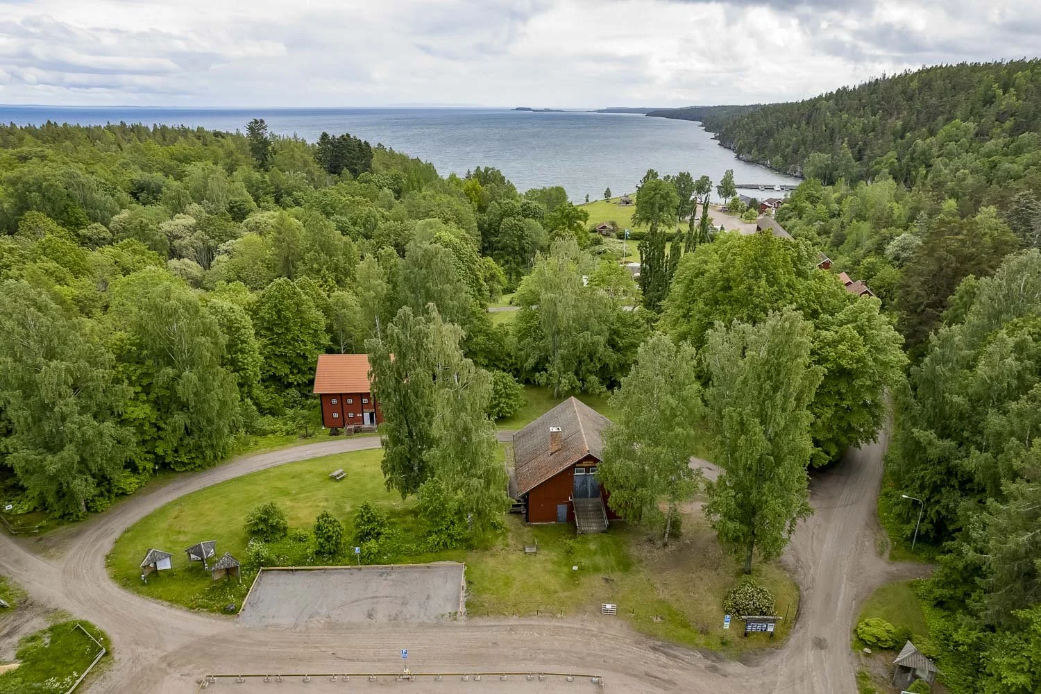 Mellan hamnen och herrgården ligger flera röda trähus på rad. Först ett av de större bostadshusen på ca 42 kvm bestående av ett sovrum och ett sällskapsrum, ett badrum med dusch och wc samt handfat. Huset värms med luftvärmepump. Bredvid ligger en vedbod följt av ett mysigt hus i ett och ett halvt plan som idag nyttjas som butikslokal. Närmast vattnet i raden står en stor logbyggnad/lada med grusat underlag. Det andra mindre gästhuset på ca 12 kvm ligger närmare vattnet med egen altan som har utsikt över Vättern.