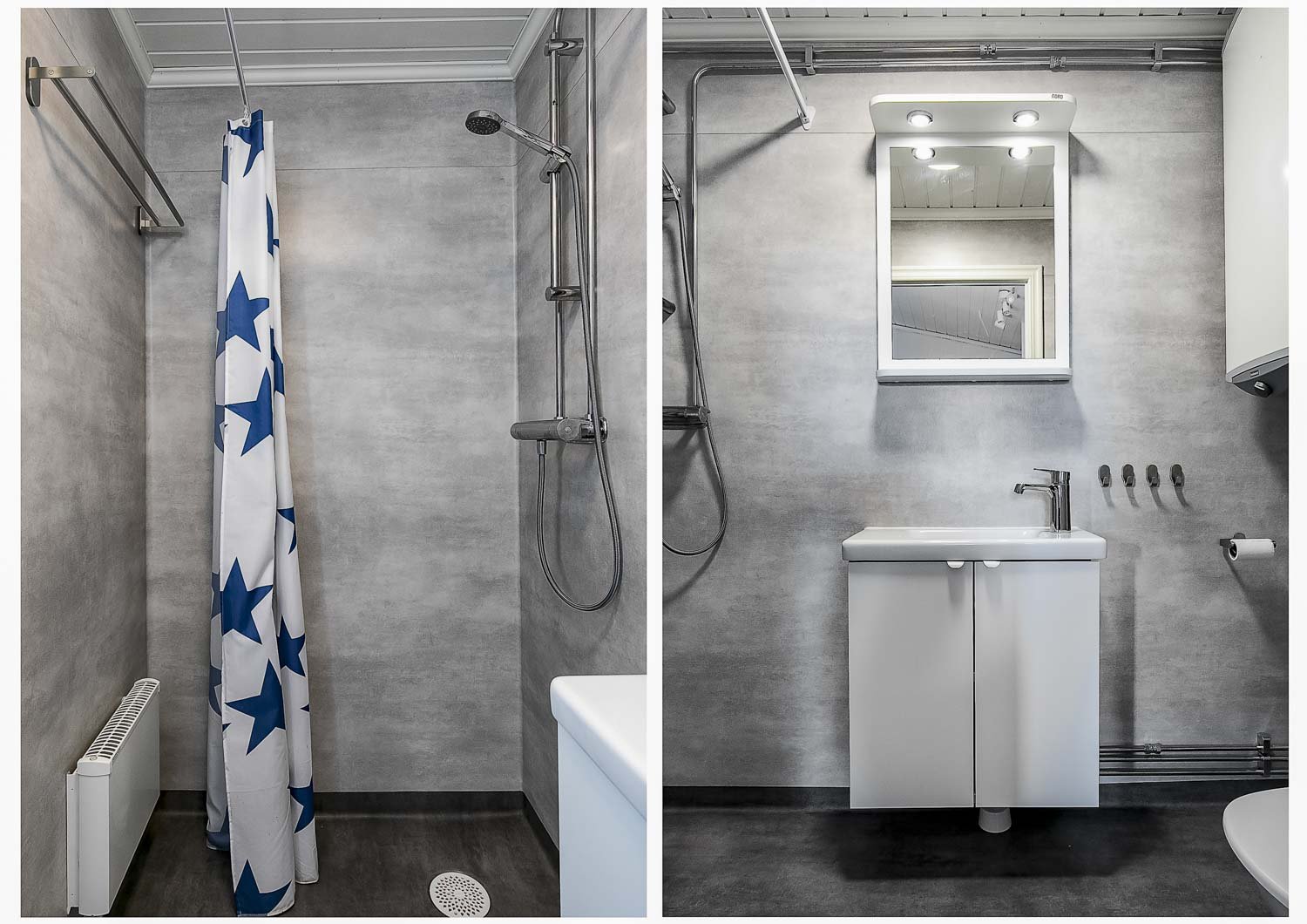 Åtta invändigt nyrenoverade stugor på 30 kvm vardera med stor altan mot vattnet. Stugorna har två mindre sovrum, ett badrum med wc, kommod och dusch samt ett sällskapsrum med köksdel. Byggnaderna står på plintar och varje stuga har en egen uteplats mot vattnet. Uppvärms med luftvärmepumpar. Stugorna ligger har tomträtt, marken ägs av Karlsborgs kommun.